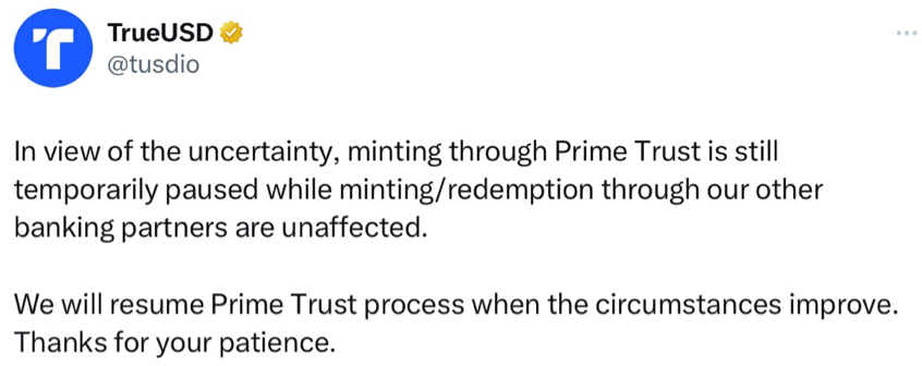 针对此前停止令,作为 Prime Trust 托管客户之一的稳定币 TrueUSD 立即出面回应:旗下稳定币 TUSD 资金仍然安全,TrueUSD 没有 Prime Trust 的风险敞口,未受此情况影响,且所有用户资金都是安全的。而早在本月 10 日,TrueUSD 就发表申明,已暂时停止通过 Prime Trust 铸造。